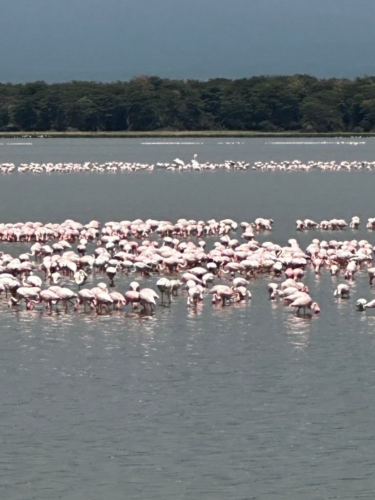 We continued driving, and in a different body of water we saw the most beautiful flamingos with white backs and bright hues of pink and coral. When they flew you could see the bright color under their wings and on their legs. They were long and graceful flying along the waters edge.