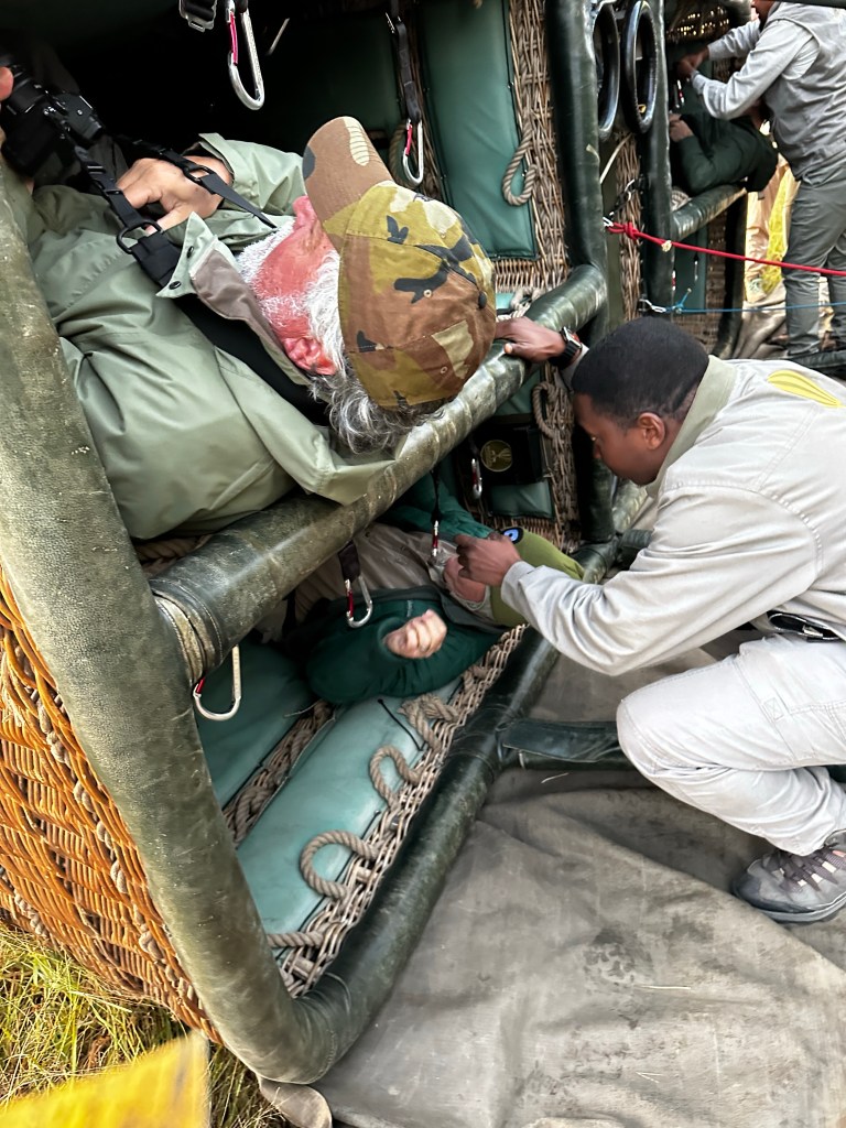 We floated with the wind following two other balloons. The ride was smooth and peaceful. We floated for about an hour and then landed in the tall grass not far from the camp.