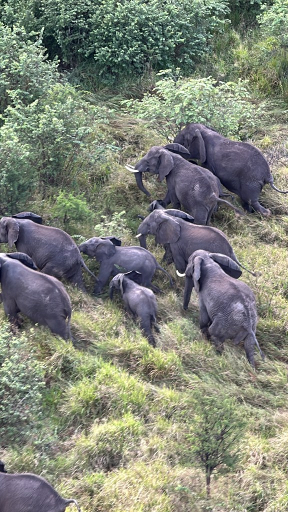 Elephant herd spooked by the burner on the balloon.